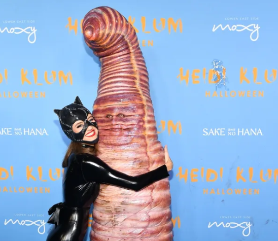 La modelo, de 49 años, se dedicó por completo a su gran espectáculo anual de Halloween y se presentó como un "gusano de lluvia", comúnmente conocido en los Estados Unidos como lombriz de tierra.