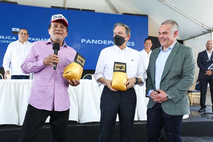 Durán obsequió un guante y una faja de campeón de boxeo al presidente Cortizo Cohen, en nombre de todos los campeones mundiales de Panamá, y un guante de boxeo al director de Pandeportes Héctor Brands.