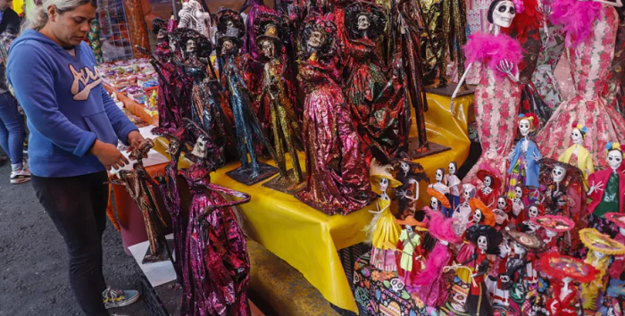 Uno de ellos es Aarón Díaz, quien vende cráneos de resina, personajes conocidos como catrinas y catrines de más de un metro de altura, así como figuras del prehispánico xoloitzcuintle, un perro que ayuda a los difuntos a cruzar al más allá, según las tradiciones ancestrales.